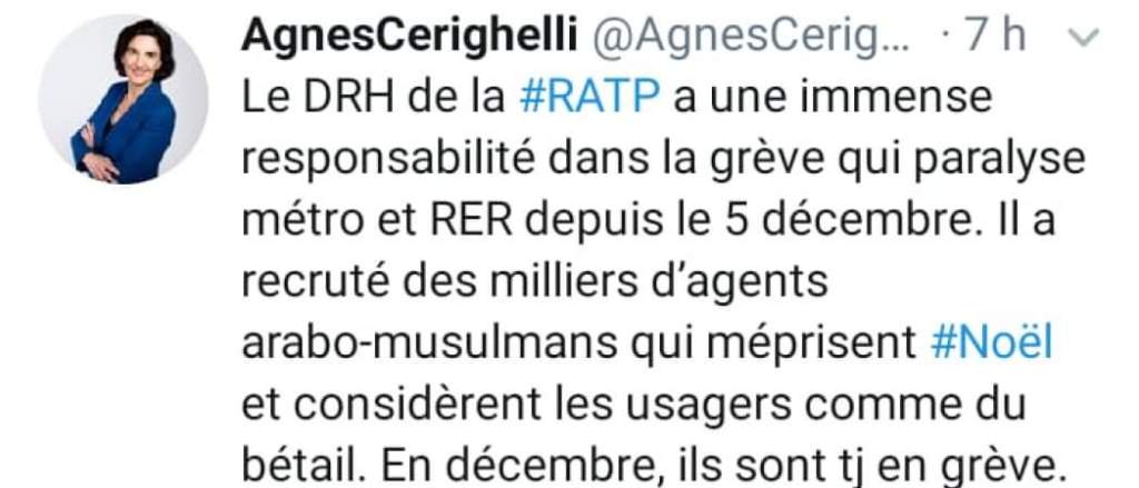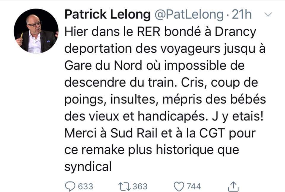 Depuis le début du mouvement de grève contre la réforme des retraites, les grévistes sont la cible d’une déferlante haineuse. On connaissait le traditionnel discours antigrévistes de la « prise d’otage » des « honnêtes citoyens » par les cheminots grévistes. Certains opposants à la grève n’hésitent désormais pas à franchir un pas de plus dans le dégueulasse en ajoutant l’islamophobie et l’antisémitisme au mépris de classe habituel : après les propos islamophobes d’Agnès Cerighelli attribuant la responsabilité de la grève à l’approche de noel au « prosélytisme islamique », voilà que le journaliste Patrick lelong se vautre dans une forme de négationnisme bon teint, sans que cela soulève guère de réaction indignées : Il compare les trains bondés suite aux ralentissements des transports en commun du fait de la grève interprofessionnel initiée par les cheminots de la SNCF et les salariés de la RATP à Drancy aux convois de déportés pendant la guerre, et parle de « déportation ».