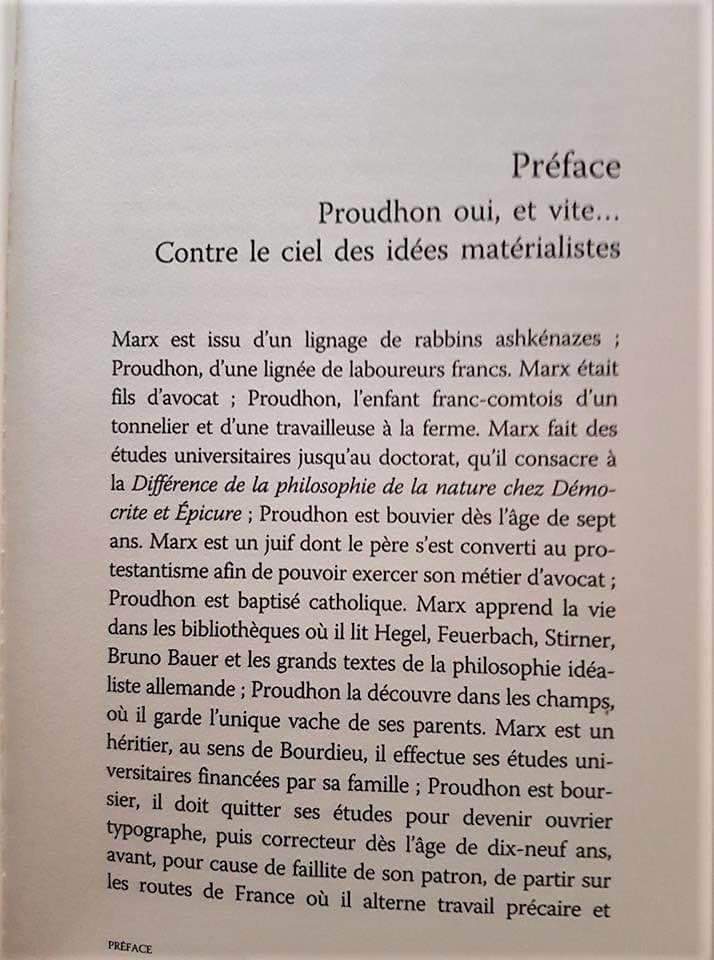 Dans ce texte, Michel Onfray prétend comparer Proudhon et Marx. La première phase est « Marx est issu d’une lignée de rabbins ashkénazes ; Proudhon d’une lignée de laboureurs francs. » La suite constitue un développement de cette opposition entre un Marx héritier, universitaire, juif, rat de bibliothèque, fils d’avocat converti au protestantisme et un Proudhon bouvier, allant aux champs, issu d’une famille catholique, abandonnant les études pour travailler. Cette opposition peut paraître factuelle, elle vient pourtant d’un choix de la part de l’auteur d’utiliser des ressorts antisémites. Déjà car il a choisi que ce qui était le plus signifiant pour opposer Marx et Proudhon, c’était de mettre en avant le judaïsme du premier, malgré la conversion de son père, malgré qu’enfant son baptême ait été luthérien, malgré le peu de référence au judaïsme dans ses œuvres principales (sinon dans « Sur la question juive », ouvrage sur lequel il est revenu qui reprenait un grand nombre de préjugés antisémites). Ensuite car il s’agit de mettre en avant un stéréotype traditionnel de l’antisémitisme (que Michel Onfray ne peut pas ignorer) : celui du riche juif errant face au travailleur français enraciné (le théoricien antisémite Alain Soral parle ainsi de « capital nomade »), et plus largement d’une imagerie habituelle à tout les racismes qui cherche à opposer un peuple français supposé travailleur à des minorités nationales composées de voleurs, de fainéants, ou de banquiers. Face au juif Marx, Proudhon viendrait ainsi d’une « lignée de laboureurs francs », façon de faire remonter la présence de sa famille sur le sol français au haut Moyen-âge. Ce procédé est d’autant plus douteux que l’antisémitisme de Proudhon, à qui le livre est consacré, est connu et que Michel Onfray ne peut pas l’ignorer. Il ne peut pas non plus ignorer que la pensée de Proudhon, si elle a pu influencer des courants socialistes révolutionnaires, internationalistes et antifascistes dans certains de ses aspects progressistes, comportait aussi une part réactionnaire, raciste et misogyne qui en fait aussi une partie de l’héritage idéologique fasciste. C’est d’ailleurs autour de cette pensée que l’extrême droite a historiquement cherché à développer son influence en milieu ouvrier ( Proudhon étant utilisé comme figure d’un prétendu « socialisme national » par opposition au « socialisme international » dont Marx serait la figure).