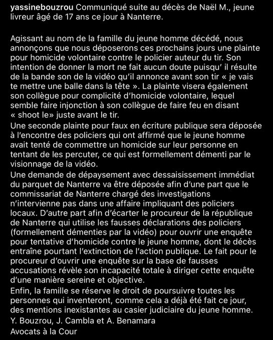La famille de Naël appelle à une marche blanche jeudi 29 juin à 14h, devant la préfecture de Nanterre. Soyons nombreux·ses.