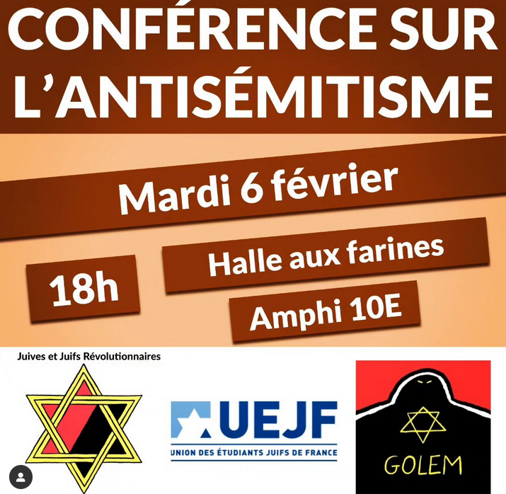 Nous en discuterons ensemble le mardi 6 février à 18h dans l’amphi 10E avec l’UEJF Paris Cité, le collectif Golem et Juives et Juifs Révolutionnaires.