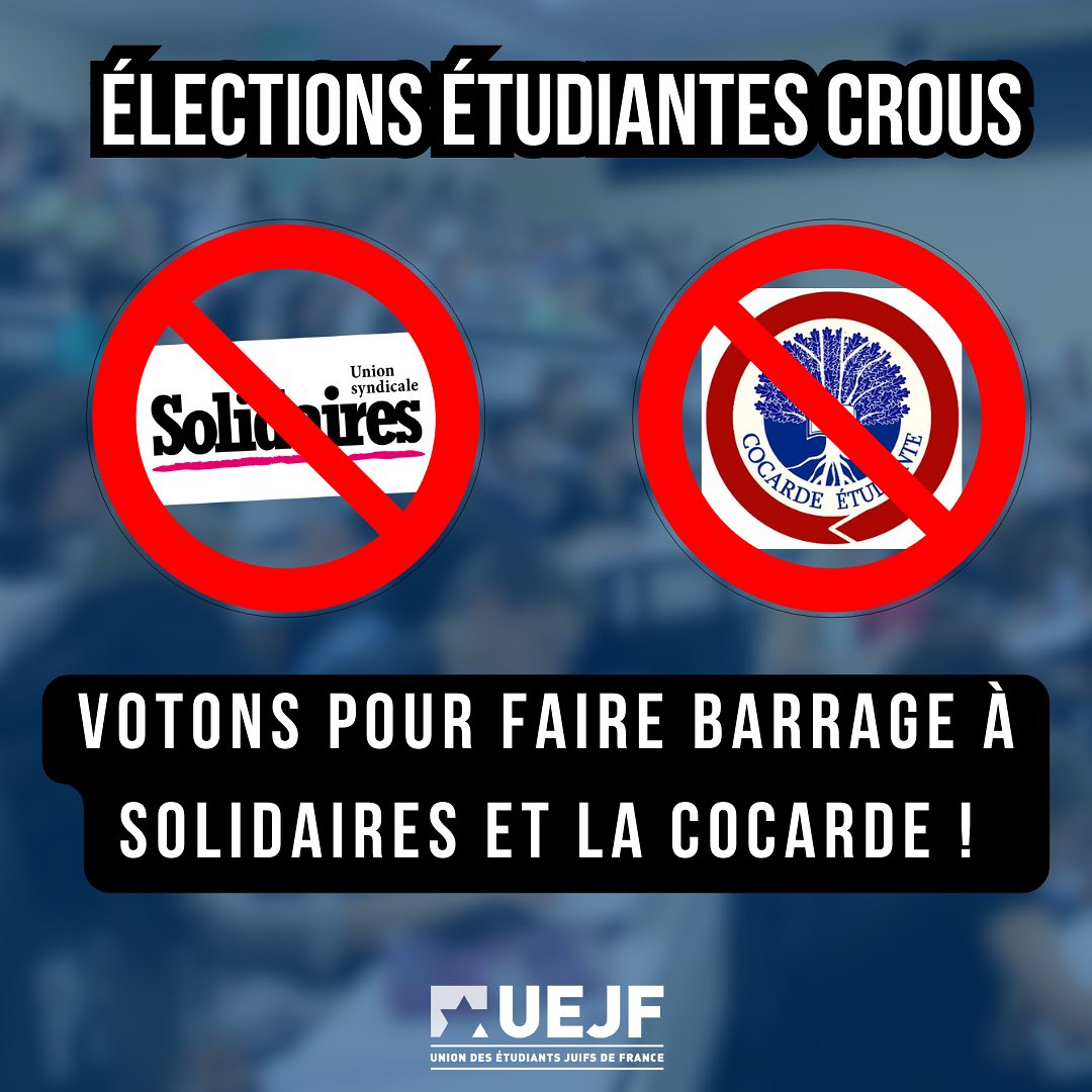 Aujourd’hui, c’est un autre désaccord de fond avec la direction de l’UEJF que nous devons exprimer : celui qui consiste, dans le cadre des élections au CROUS, à renvoyer dos à dos l’organisation d’extrême droite La Cocarde et les syndicats Solidaires Étudiant·es.