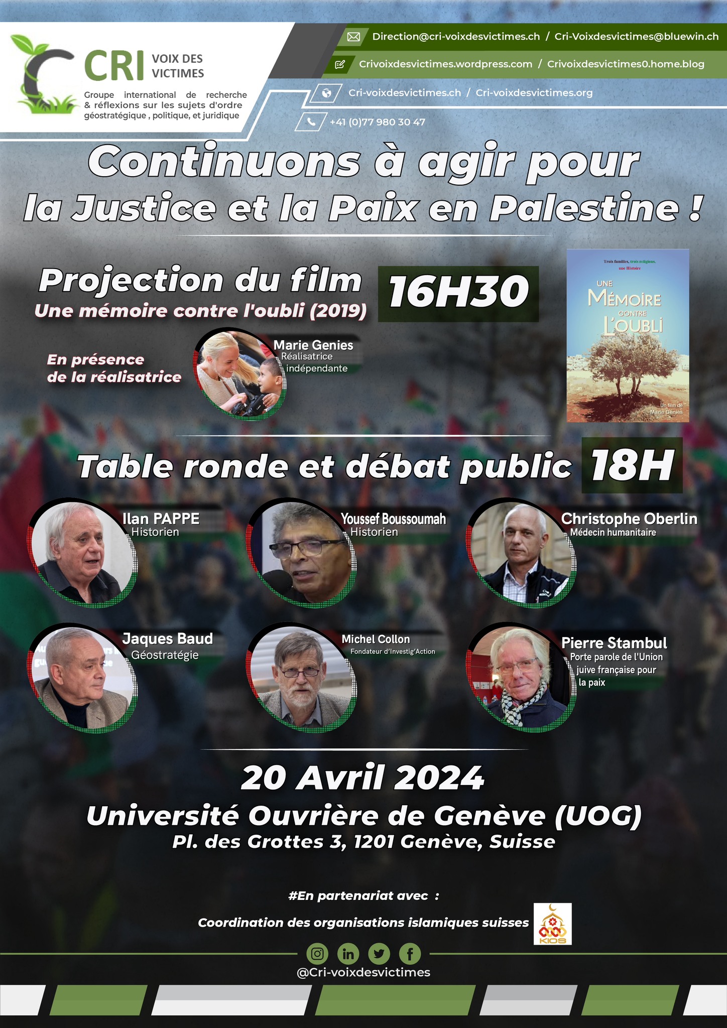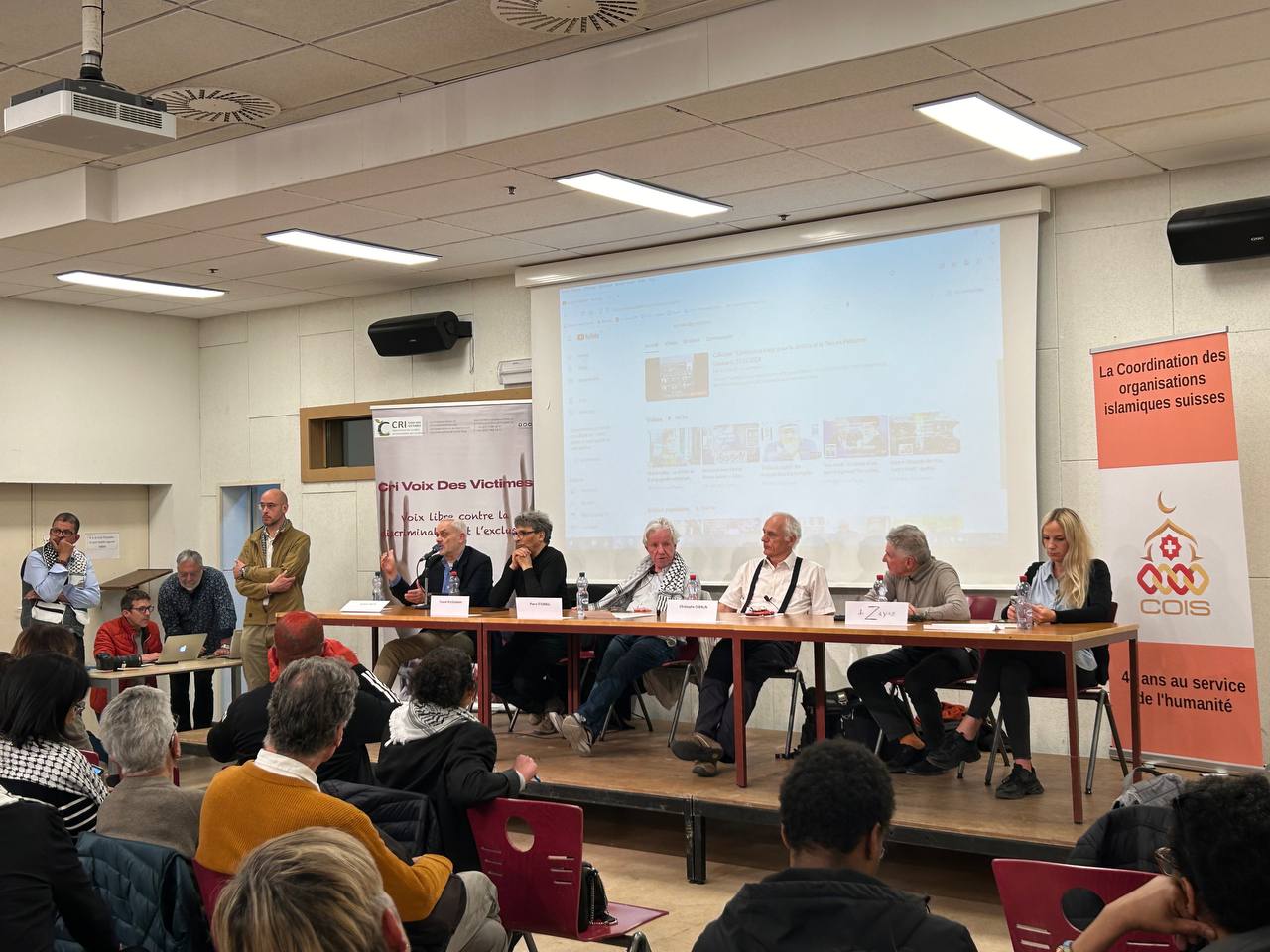 Le 20 avril 2024, une conférence « pour la justice et la paix en Palestine » était organisée à Genève. Sept intervenant·es faisaient office de tête d’affiche. Parmi eux, des personnalités connues du monde militant antisioniste, comme Pierre Stambul, pilier de l’UJFP, ou l’historien Ilan Pappe. A leurs côtés, figuraient également certaines personnalités porteuses d’un discours complotiste ou relais occidentaux de la propagande de Bachar el-Assad et de Vladimir Poutine, comme Michel Collon ou Jacques Baud.