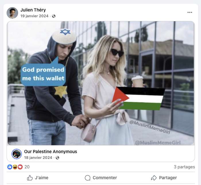 Quant à la notion « d’antisémitisme de gauche », elle serait née au XXIe siècle. Julien Théry fait ici semblant de croire que le sujet est apparu avec le livre de Michel Dreyfus en 2009, comme si il n’existait pas en d’autres termes depuis des décennies (il semble n’avoir jamais entendu parler des travaux de Zeev Sternhell, de Moishe Postone, de Léon Poliakov, ou à vrai dire de qui que ce soit de sérieux). En fait, l’historien n’utilise le débat antisémitisme de gauche / antisémitisme à gauche que comme diversion. Dans tous les cas, pour lui la question est vite réglée : l’accusation d’antisémitisme ne serait qu’un outil au service de la propagande des « sionistes », et tant pis pour celles et ceux qui se mobilisent sur la question, tant pis surtout pour les Juif·ves qui subissent au quotidien (à force de victimisation des antisémites, on les oublierait presque).